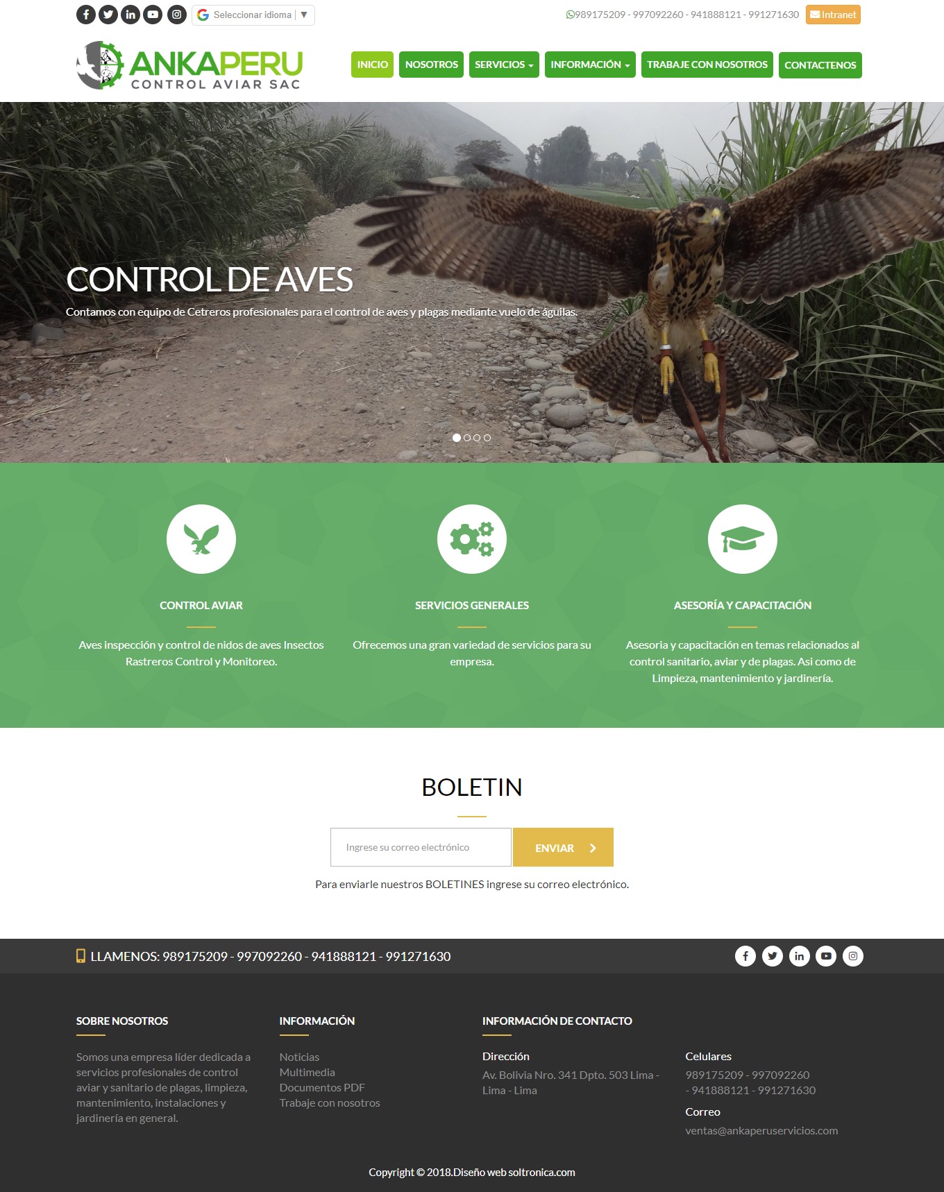 Soltronica ha realizado la web de AnkaPeru control aviar S.A.C utilizando tecnología BOOTSTRAP, PHP, HTML 5, JAVASCRIPT y CSS3.
